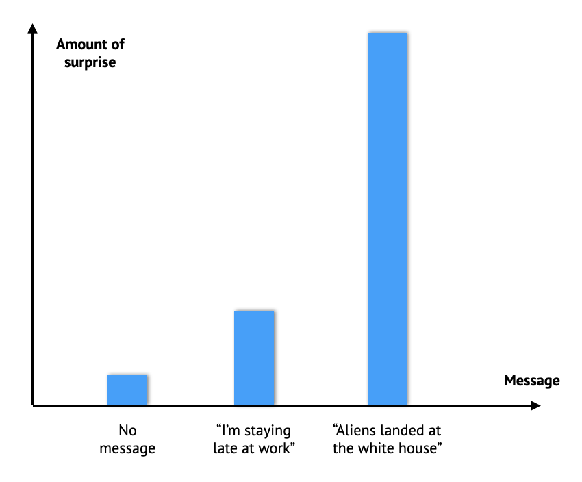 To do this, let’s think about what it means for Bob to receive a message from Alice. We can imagine all the possible messages Alice could send Bob, and for completeness let’s include the “no message” as a kind of message as well. For each such message we can start by asking ourselves the somewhat odd question: “how much this message would surprise Bob”? The “no message” message for example would probably not surprise Bob very much, as typically he would not expect to receive a message from Alice. On the other hand, if he were to receive the message “An alien spaceship has just landed in front of the white house”, he would probably be very surprised (assuming he did not already hear about this in the news). The message “I have to stay late at work” lies somewhere in between. So we can certainly rank the messages according to how much they would surprise Bob: