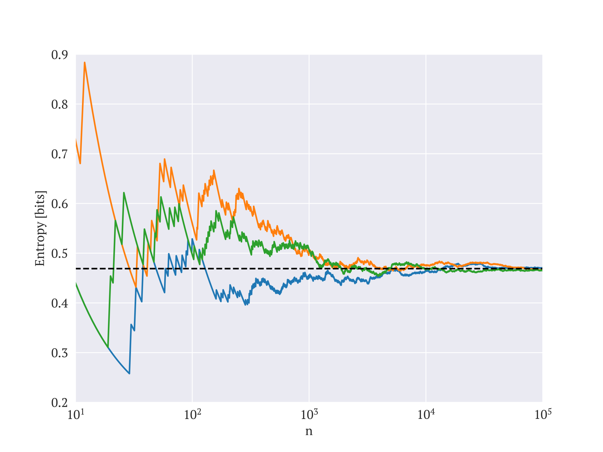 To illustrate the entropy convergence, the figure below shows the entropy of three randomly generated sequences of 100,000 toss results of our biased coin. The value of the graph at each point is the entropy calculated using the first $n$ entries in the sequence. We can see that the convergence is not very fast, as a few thousands of realizations are required to get a descent approximation to $H(X)$. Regardless, it also shows that indeed the empirical entropy does eventually converges to the theoretical one.
